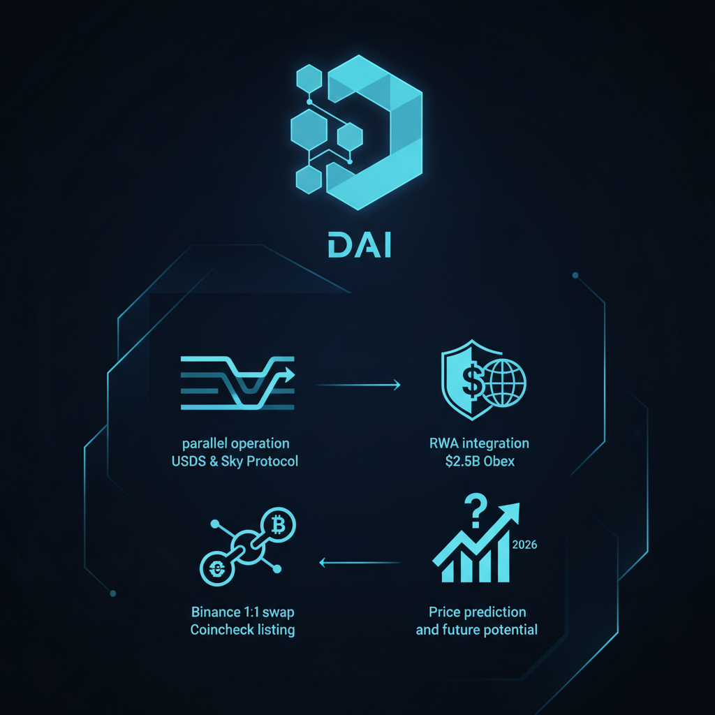 ダイ(DAI)の今後を2026年4月時点で解説。MakerDAOのSky Protocolリブランドに伴うUSDSとの並行運用、4/9にBinance完了の自動1:1スワップ、Spark SubDAOと$2.5BのObexによるRWA統合、Sky/DAI合計時価総額$13.4B、国内Coincheckでの取扱、価格予想と将来性、買い方ステップまでまとめます。
